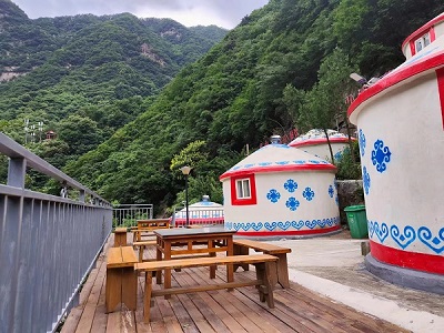 蒙古包是蒙古族牧民居住的一种房子,适于牧业生产和游牧生活。蒙古包包内宽敞舒适,是用特制的木架做"哈那"(蒙古包的围栏支撑),用两至三层羊毛毡围裹而成,之后用马鬃或驼毛拧成的绳子捆绑而成,其顶部用"乌耐"作支架并盖有"布乐斯",以呈天幕状。其圆形尖顶开有天窗"陶脑",上面盖着四方块的羊毛毡 "乌日何",可通风、采光,既便于搭建,又便于拆卸移动,适于轮牧走场居住。 广新园民族村的蒙古部落根据景区地势和山里潮湿的环境进行了改造。蒙古部落建在虎山脚下,多个蒙古包连成一片,吸引无数游客,多次观赏游览。